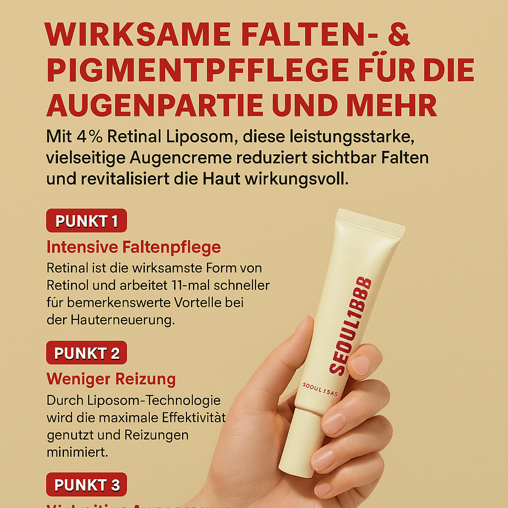 Die Eye Cream mit fermentierter Bohne und Retinal Liposom 4 % wirkt gezielt gegen Fältchen, Schwellungen und Augenringe. Sie stärkt die Hautbarriere, fördert die Zellerneuerung und sorgt für eine erholte, wache Augenpartie. Das Serum mit Retinal Liposom 2 % und Black Ginseng ergänzt die Wirkung, indem es die Hautstruktur verbessert, die Kollagenproduktion anregt und die Elastizität erhöht – für einen spürbar verfeinerten Teint.