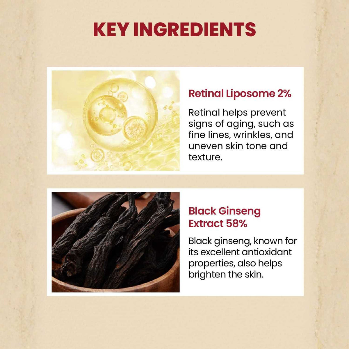 Water, Glycerin, Dipropylene Glycol, Caprylic/Capric Triglyceride, 1,2-Hexanediol, Butylene Glycol Dicaprylate/Dicaprate, Niacinamide, Pentaerythrityl Tetraethylhexanoate, Cetearyl Alcohol, Butylene Glycol, Cetearyl Olivate, Sorbitan Olivate, Hydrogenated Lecithin, Macadamia Ternifolia Seed Oil, Carbomer, Tromethamine, Propanediol, Glyceryl Stearate, Cholesterol, Polyglyceryl-10 Oleate, Ethylhexylglycerin, Adenosine, Brassica Campestris (Rapeseed) Sterols, Phytosteryl/Behenyl/Octyldodecyl Lauroyl Glutamate, Retinal, Silica, Disodium EDTA, Aluminum/Magnesium Hydroxide Stearate, Lactobacillus/Panax Ginseng Root Ferment Filtrate, Lactobacillus/Rice Ferment, Lactobacillus/Soybean Ferment Extract, Saccharomyces/Coix Lacryma-Jobi Ma-yuen Seed Ferment Filtrate, Saccharomyces/Potato Extract Ferment Filtrate, Tocopherol, Potassium Cetyl Phosphate, Pentaerythrityl Tetra-di-t-Butyl Hydroxyhydrocinnamate, Sodium Hyaluronate, Arctium Lappa Root Extract, Cnidium Officinale Root Extract, Dioscorea Japonica Root Extract, Paeonia Suffruticosa Root Extract, Rehmannia Chinensis Root Extract, 3-O-Ethyl Ascorbic Acid, Bakuchiol, sh-Oligopeptide-1, sh-Oligopeptide-2, sh-Polypeptide-1.