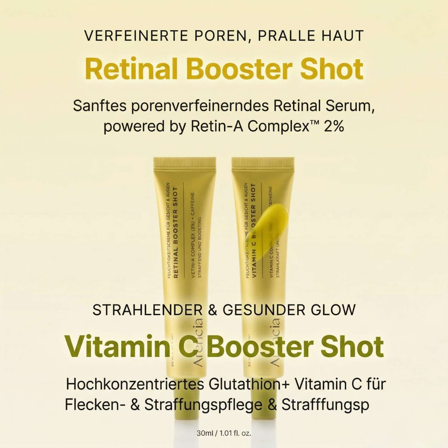 • Das Set kombiniert den Vitamin C Booster Shot 30ml für die Morgenroutine mit dem Retinal Booster Shot 30ml für die Abendpflege