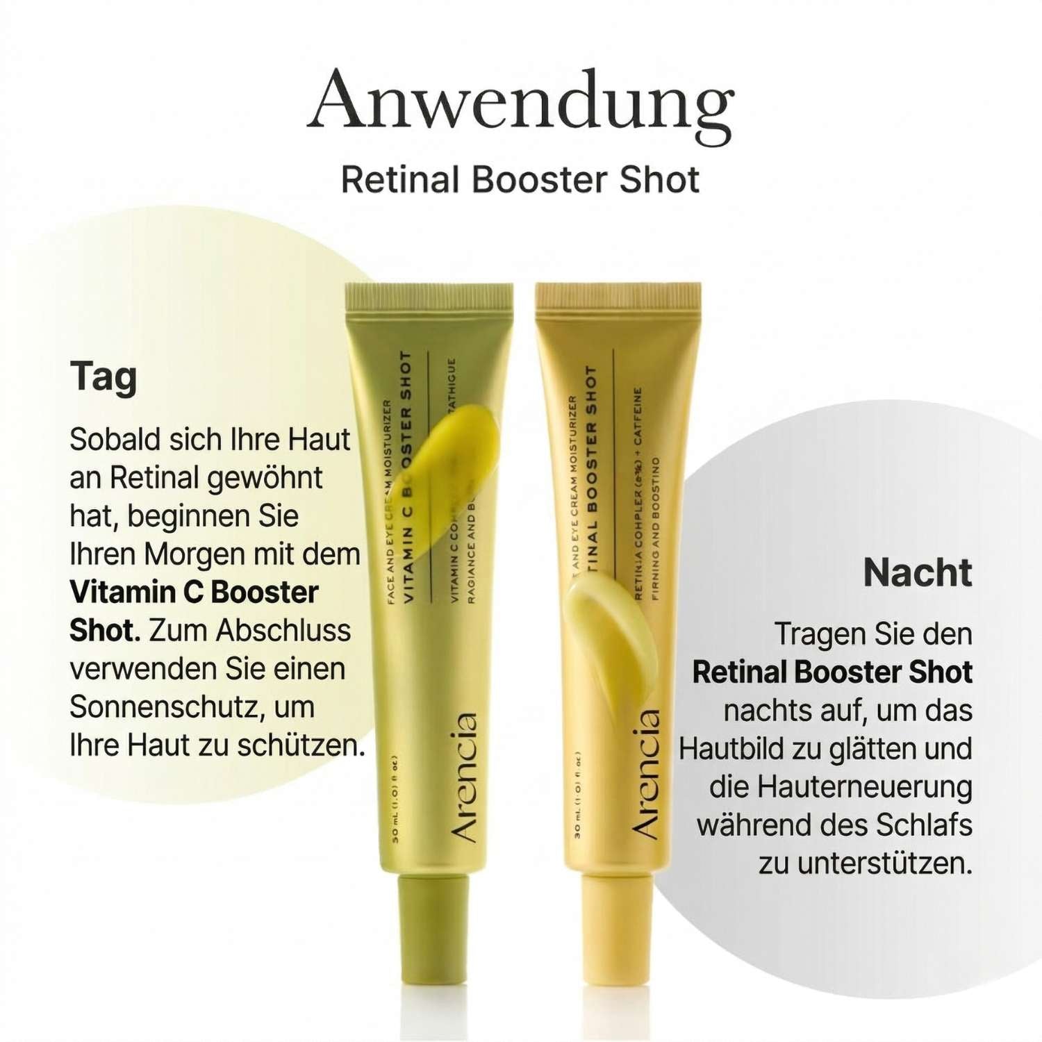 Das Arencia AM/PM Glow Shot Duo kombiniert zwei gezielte Booster für eine strukturierte Pflegeroutine am Morgen und am Abend. Das Bundle enthält den Vitamin C Booster Shot 30ml für die Tagespflege und den Retinal Booster Shot 30ml für die Abendroutine. So verbindest Du ausgleichende Pflege, frische Ausstrahlung und eine glatter wirkende Hautstruktur in einem abgestimmten Set.