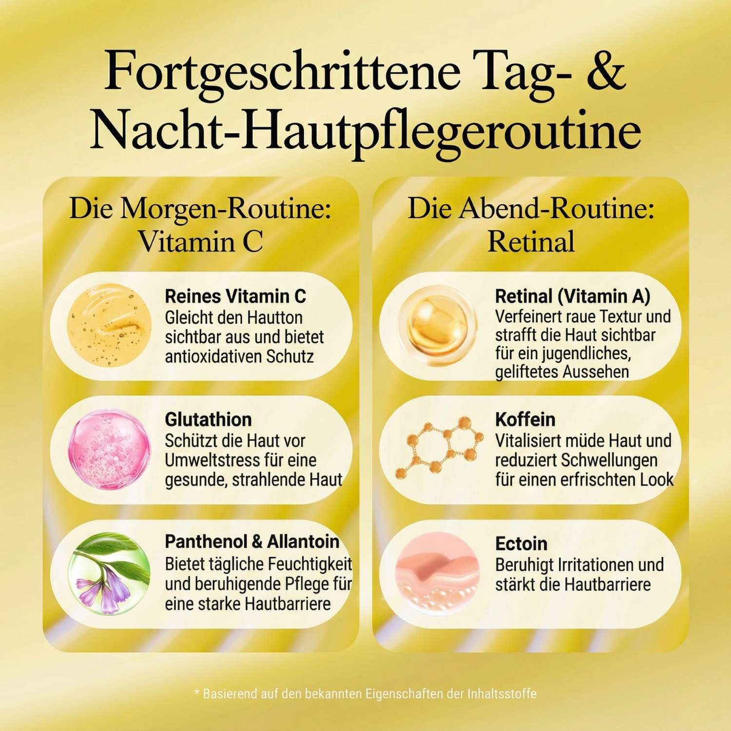 • Vitamin C wird morgens nach der Reinigung angewendet, Retinal abends auf trockener Haut und zu Beginn schrittweise in die Routine integriert